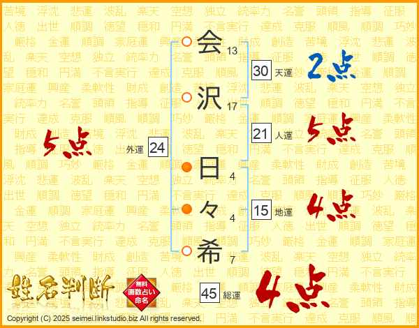 会(13画)沢(17画) 日(4画)々(4画)希(7画)