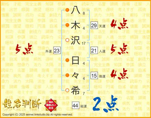 八(8画)木(4画)沢(17画) 日(4画)々(4画)希(7画)