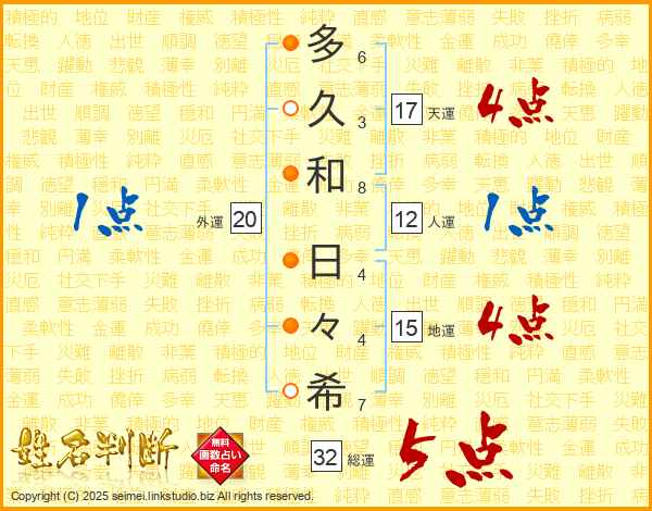 多(6画)久(3画)和(8画) 日(4画)々(4画)希(7画)