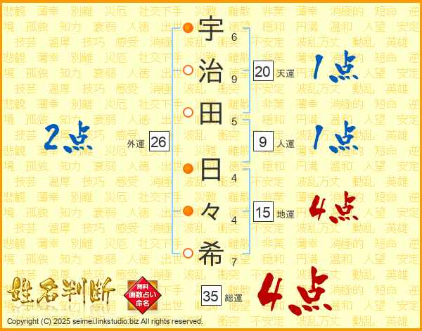 宇(6画)治(9画)田(5画) 日(4画)々(4画)希(7画)