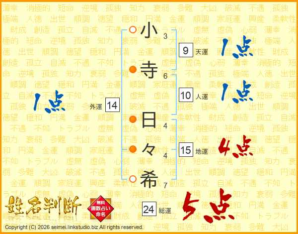 小(3画)寺(6画) 日(4画)々(4画)希(7画)