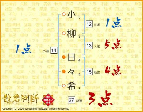 小(3画)柳(9画) 日(4画)々(4画)希(7画)