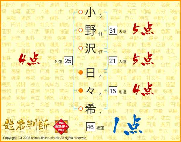 小(3画)野(11画)沢(17画) 日(4画)々(4画)希(7画)