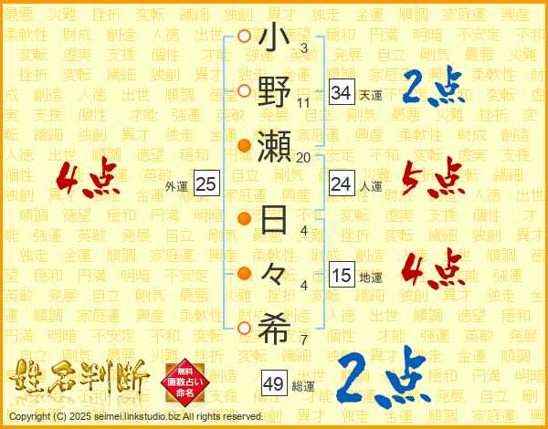 小(3画)野(11画)瀬(20画) 日(4画)々(4画)希(7画)