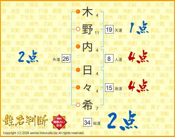 木(4画)野(11画)内(4画) 日(4画)々(4画)希(7画)