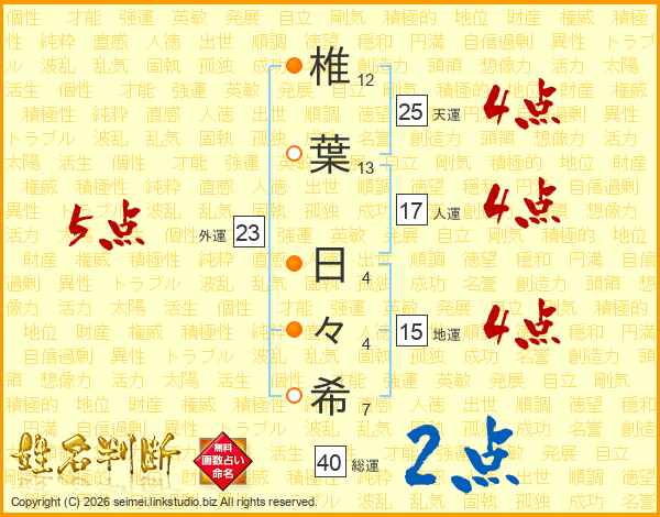 椎(12画)葉(13画) 日(4画)々(4画)希(7画)