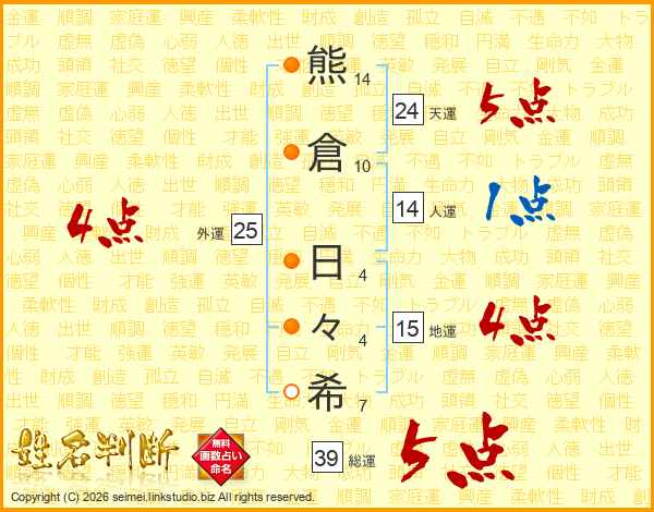 熊(14画)倉(10画) 日(4画)々(4画)希(7画)