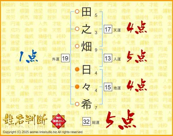 田(5画)之(3画)畑(9画) 日(4画)々(4画)希(7画)