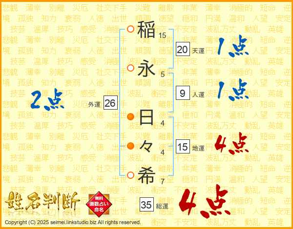 稲(15画)永(5画) 日(4画)々(4画)希(7画)