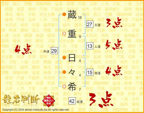 蔵(18画)重(9画) 日(4画)々(4画)希(7画)