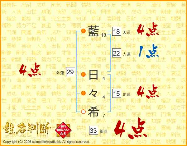 藍日々希さんの総運は33画の4点!