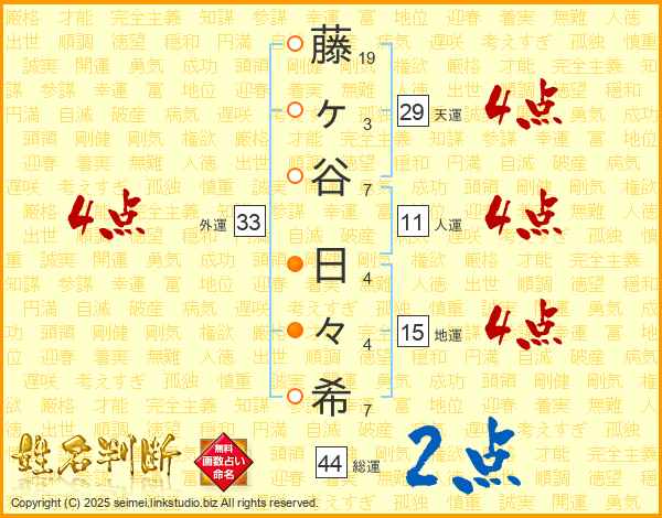 藤ヶ谷日々希さんの総運は44画の2点!