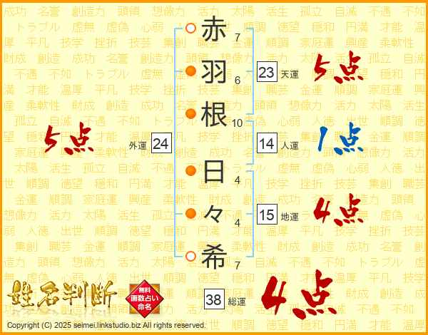 赤(7画)羽(6画)根(10画) 日(4画)々(4画)希(7画)