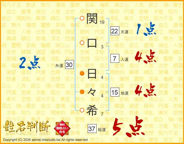 関(19画)口(3画) 日(4画)々(4画)希(7画)