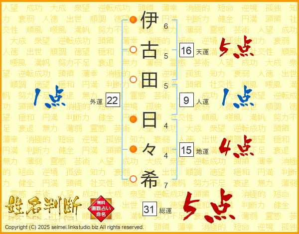 伊(6画)古(5画)田(5画) 日(4画)々(4画)希(7画)