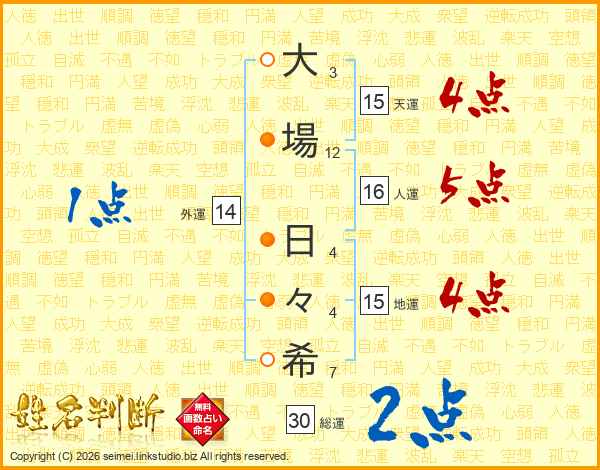 生活面を象徴する運勢です。外部から受ける影響力を表し、結婚運、家庭運や職場、環境への順応性を表します。総運から人運を引いた画数。姓や名が1文字の場合を除く。