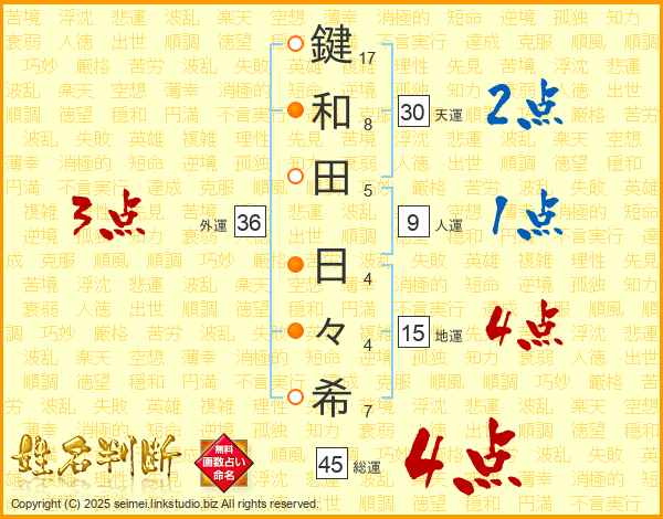 鍵(17画)和(8画)田(5画) 日(4画)々(4画)希(7画)