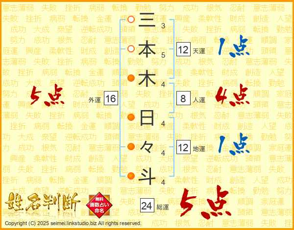 生活面を象徴する運勢です。外部から受ける影響力を表し、結婚運、家庭運や職場、環境への順応性を表します。総運から人運を引いた画数。姓や名が1文字の場合を除く。