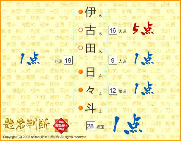 伊(6画)古(5画)田(5画) 日(4画)々(4画)斗(4画)