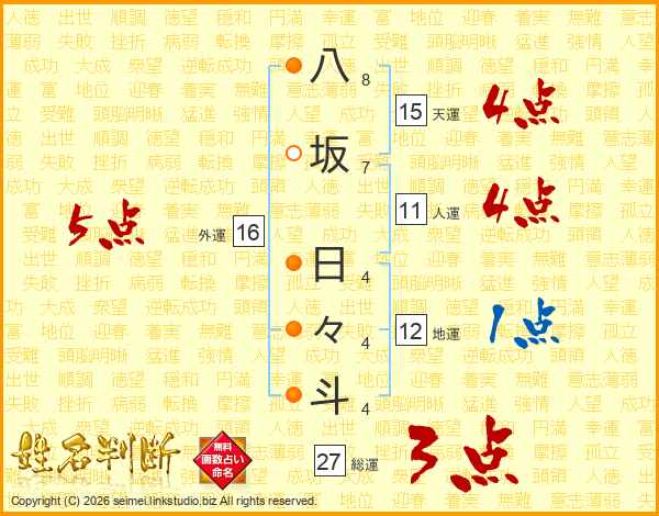 八坂日々斗さんの総運は27画の3点!