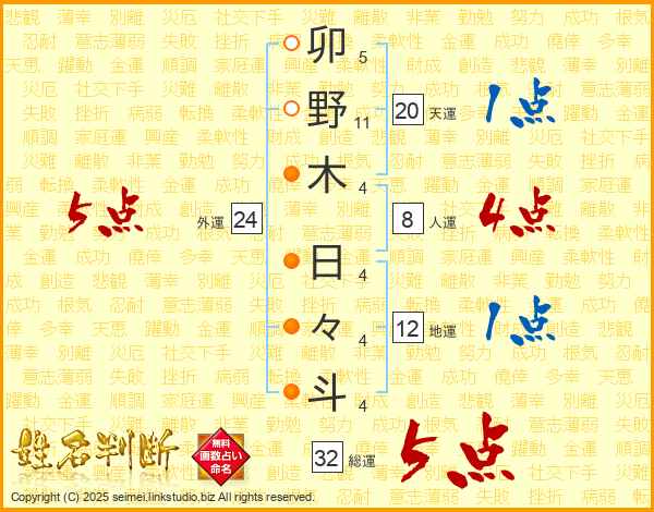 生活面を象徴する運勢です。外部から受ける影響力を表し、結婚運、家庭運や職場、環境への順応性を表します。総運から人運を引いた画数。姓や名が1文字の場合を除く。
