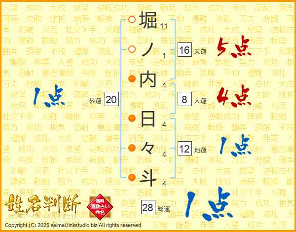 堀(11画)ノ(1画)内(4画) 日(4画)々(4画)斗(4画)