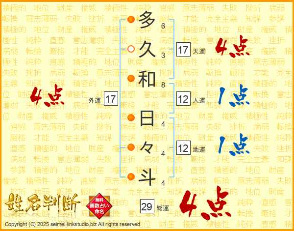 多久和日々斗さんの総運は29画の4点!