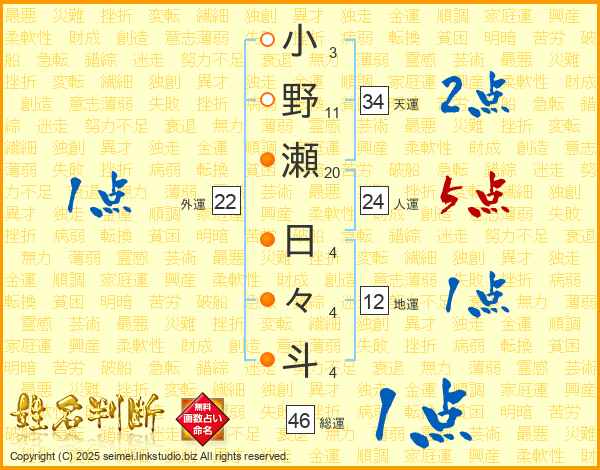 小(3画)野(11画)瀬(20画) 日(4画)々(4画)斗(4画)