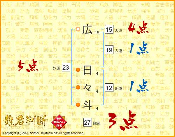 生活面を象徴する運勢です。外部から受ける影響力を表し、結婚運、家庭運や職場、環境への順応性を表します。総運から人運を引いた画数。姓や名が1文字の場合を除く。