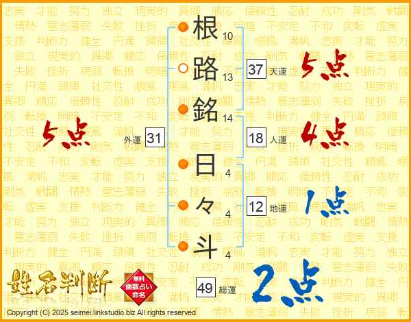 根(10画)路(13画)銘(14画) 日(4画)々(4画)斗(4画)