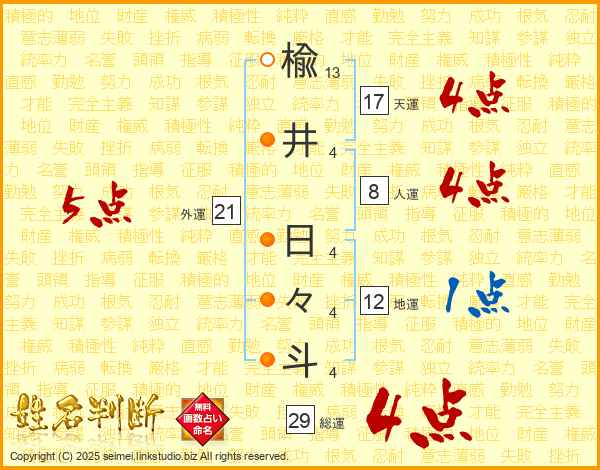 生活面を象徴する運勢です。外部から受ける影響力を表し、結婚運、家庭運や職場、環境への順応性を表します。総運から人運を引いた画数。姓や名が1文字の場合を除く。
