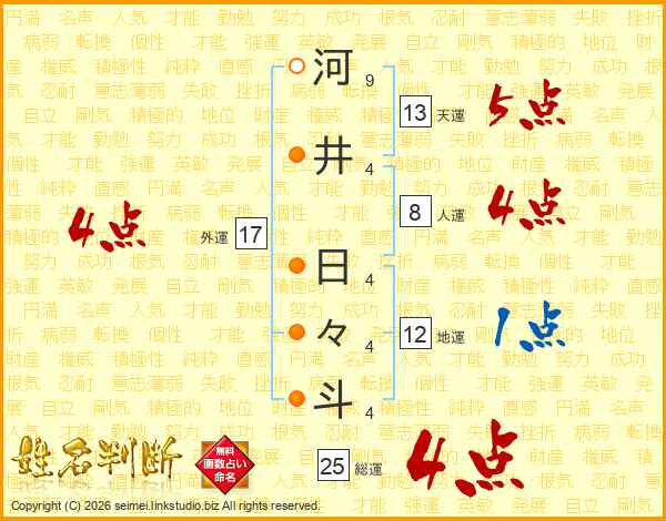 生活面を象徴する運勢です。外部から受ける影響力を表し、結婚運、家庭運や職場、環境への順応性を表します。総運から人運を引いた画数。姓や名が1文字の場合を除く。