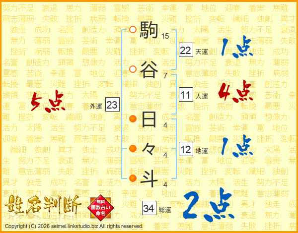 駒(15画)谷(7画) 日(4画)々(4画)斗(4画)