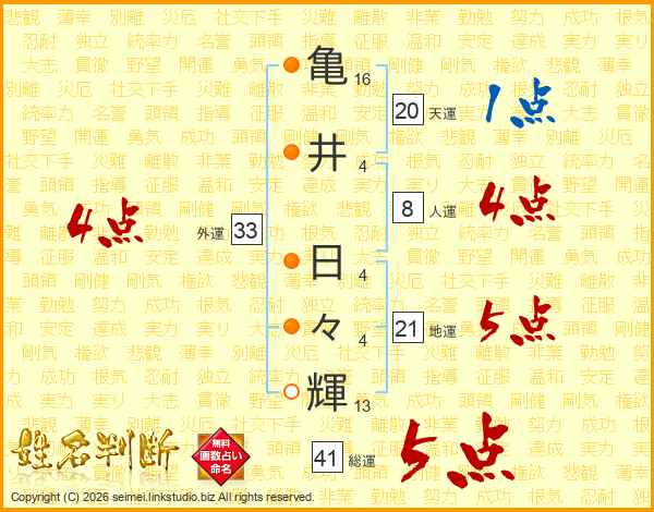 亀(16画)井(4画) 日(4画)々(4画)輝(13画)