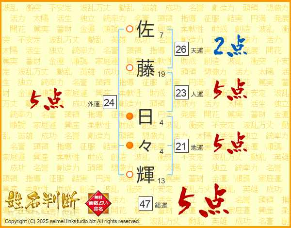 佐(7画)藤(19画) 日(4画)々(4画)輝(13画)