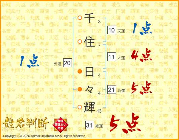千(3画)住(7画) 日(4画)々(4画)輝(13画)