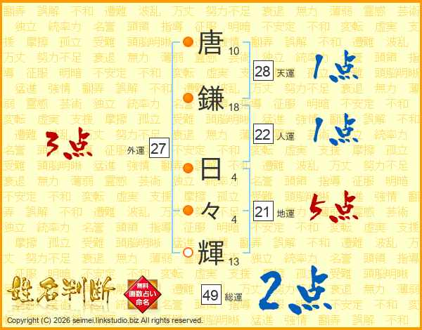 唐(10画)鎌(18画) 日(4画)々(4画)輝(13画)