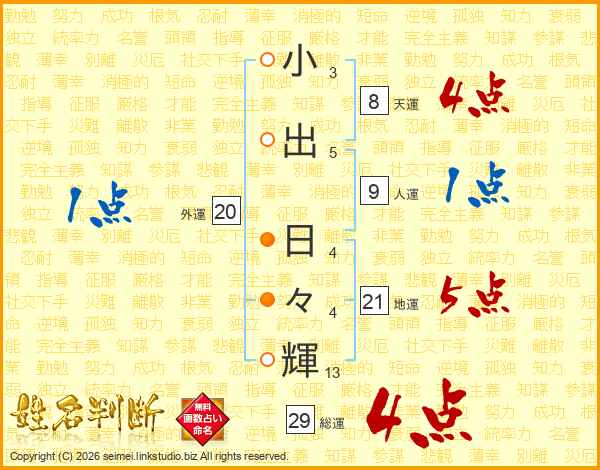 小(3画)出(5画) 日(4画)々(4画)輝(13画)