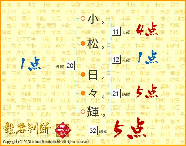 小(3画)松(8画) 日(4画)々(4画)輝(13画)