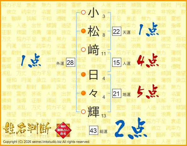 小(3画)松(8画)﨑(11画) 日(4画)々(4画)輝(13画)
