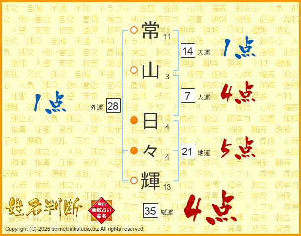 生活面を象徴する運勢です。外部から受ける影響力を表し、結婚運、家庭運や職場、環境への順応性を表します。総運から人運を引いた画数。姓や名が1文字の場合を除く。