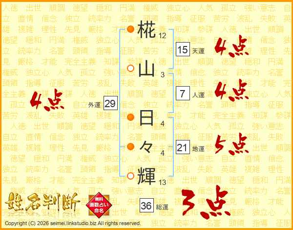 椛(12画)山(3画) 日(4画)々(4画)輝(13画)