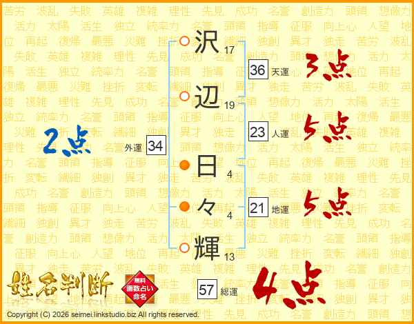 沢辺日々輝さんの総運は57画の4点!