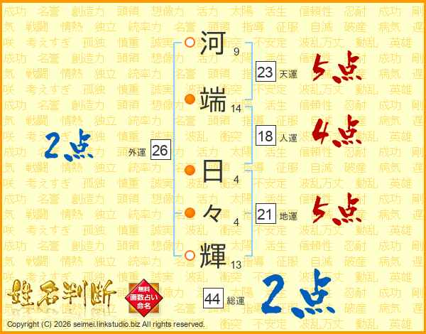 河端日々輝さんの総運は44画の2点!