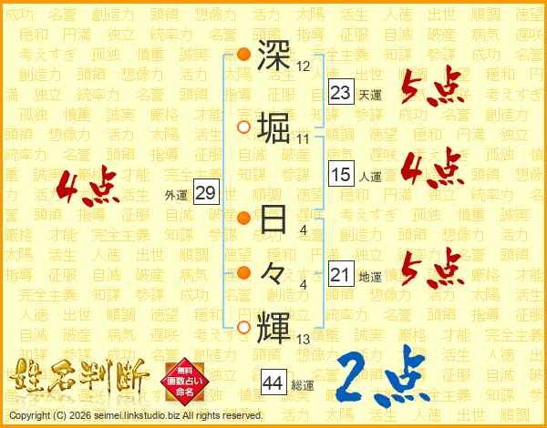 深(12画)堀(11画) 日(4画)々(4画)輝(13画)