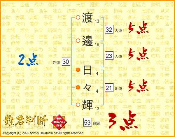 渡(13画)邊(19画) 日(4画)々(4画)輝(13画)