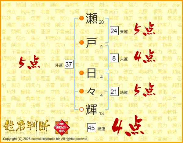瀬(20画)戸(4画) 日(4画)々(4画)輝(13画)