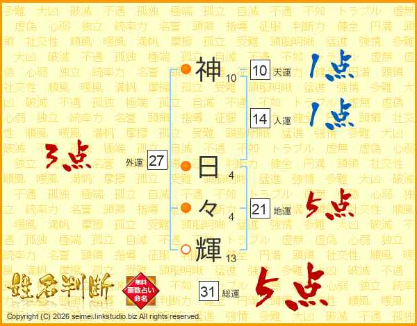 生活面を象徴する運勢です。外部から受ける影響力を表し、結婚運、家庭運や職場、環境への順応性を表します。総運から人運を引いた画数。姓や名が1文字の場合を除く。