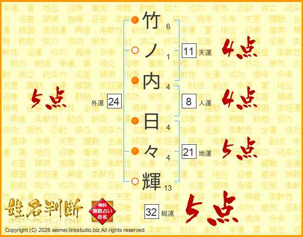 竹ノ内日々輝さんの総運は32画の5点!