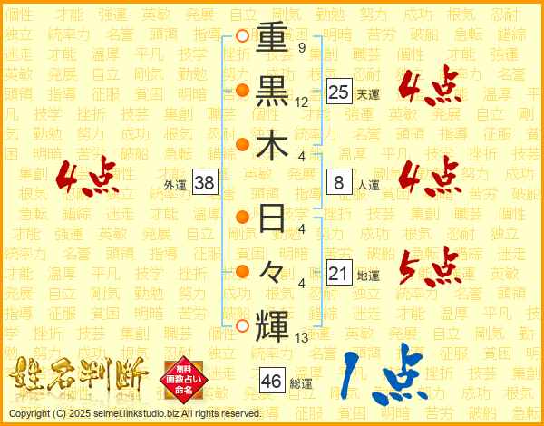 重(9画)黒(12画)木(4画) 日(4画)々(4画)輝(13画)